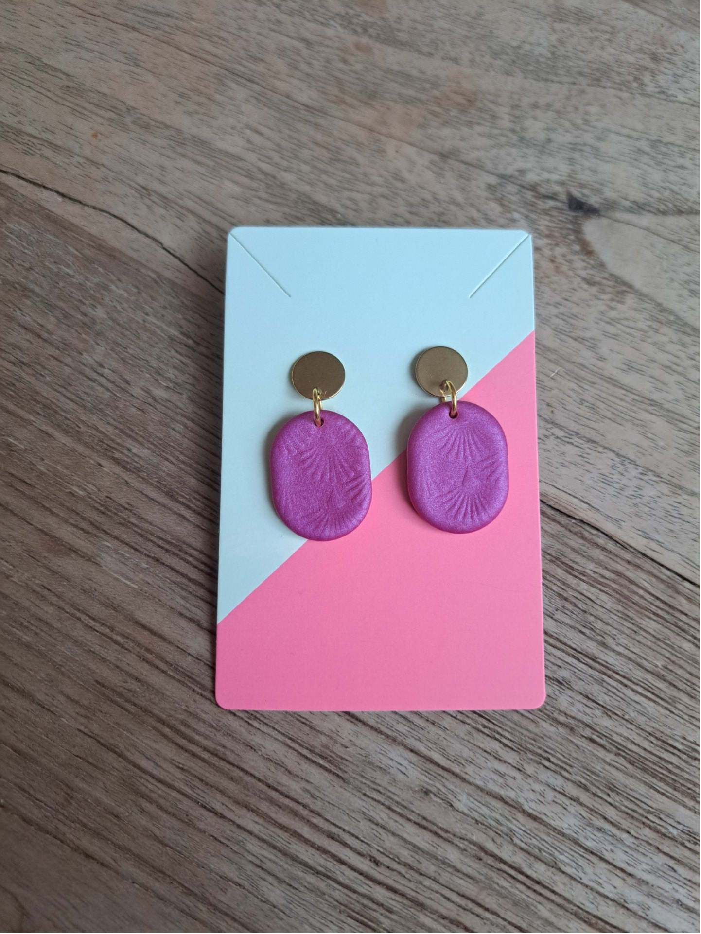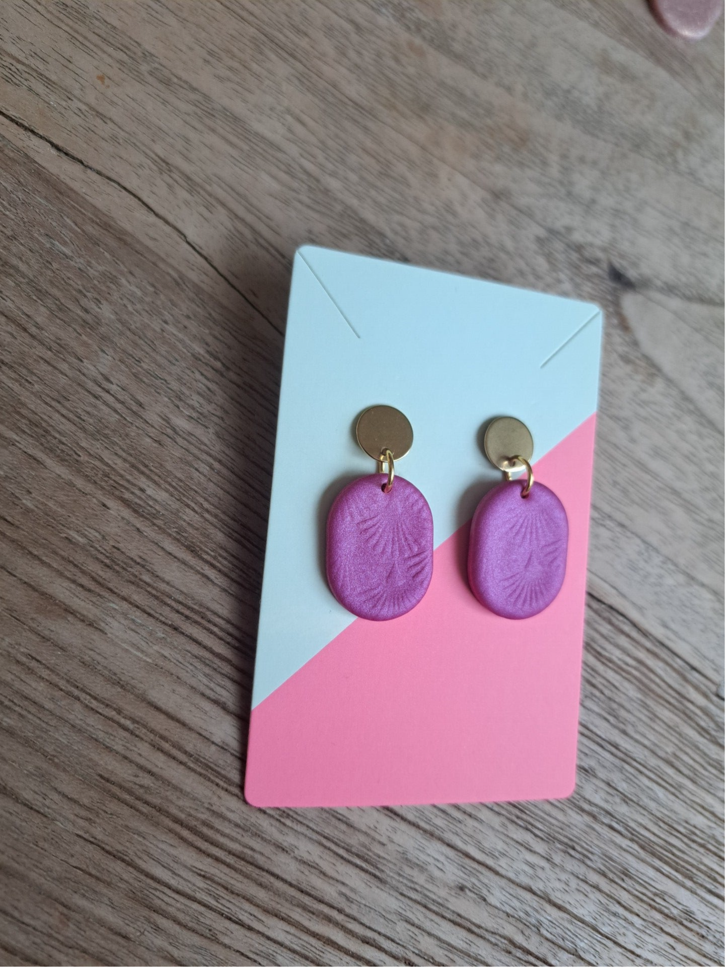 Oorbel Esther is een subtiel belletje in de hippe kleur Magneta. Mooi subtiel ingedrukt patroon.