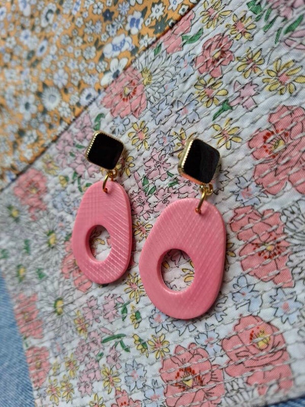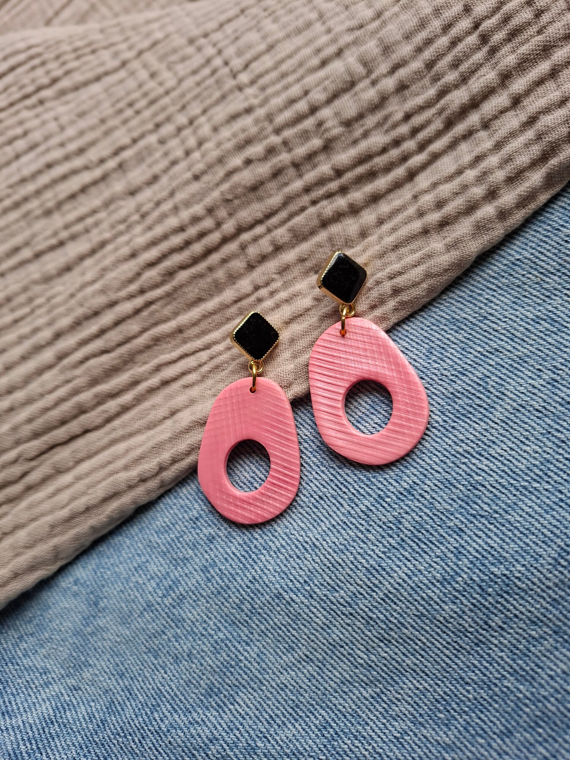 Pastelroze en zwart; lief & stoer komt hier samen in 1 oorbel. Subtiel ingewerkt ruitpatroon en fijn glansje!