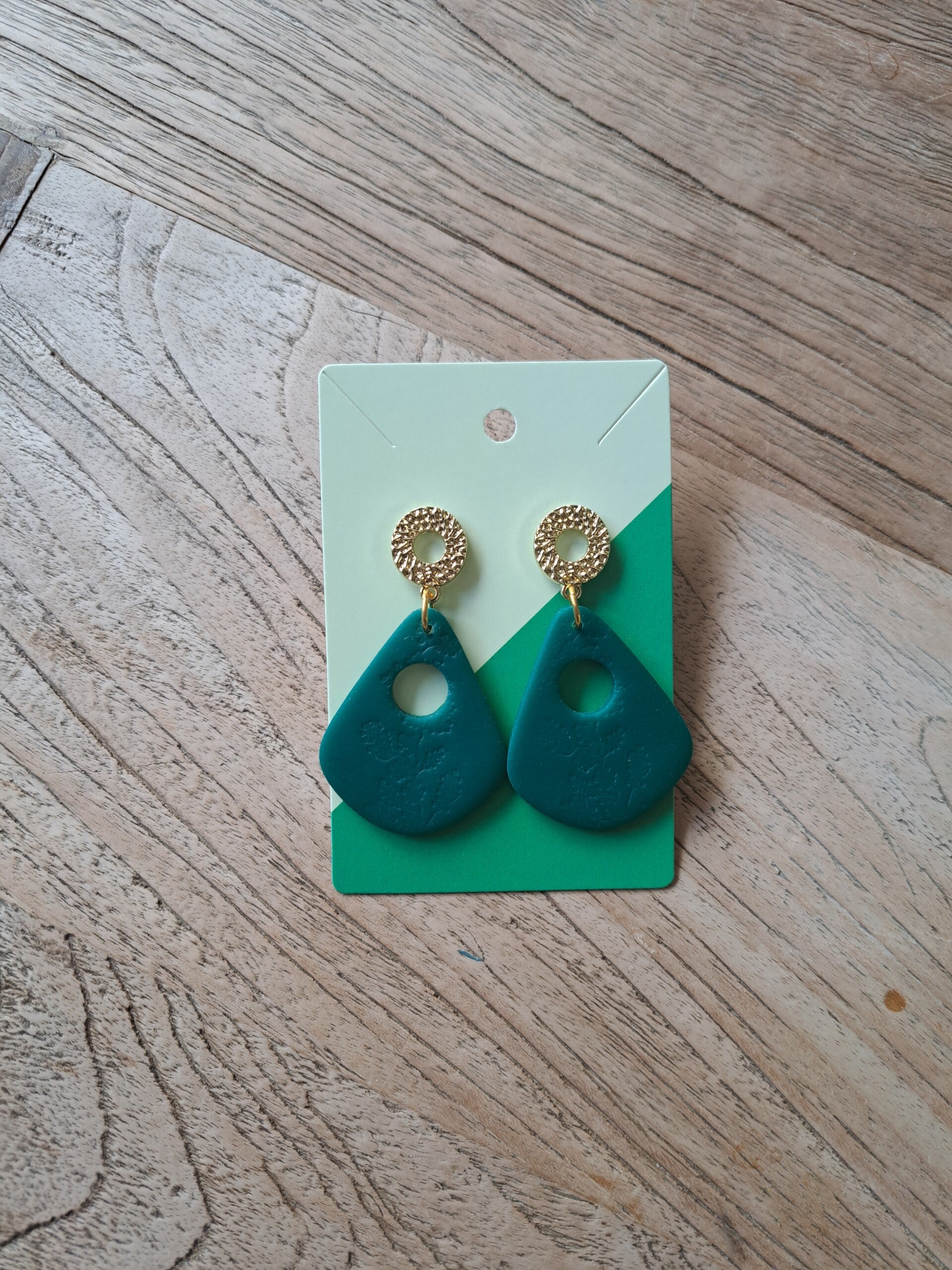 Donkergroene oorbel met een licht bloemen patroon. Urban Jungle! De match met het goudkleurige knopje (ook met patroon) is perfect.