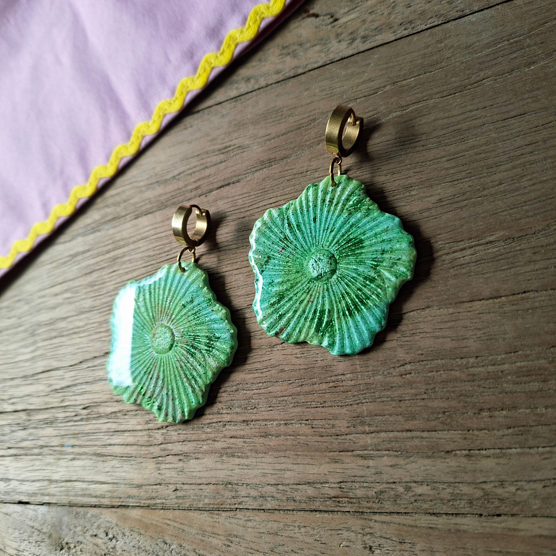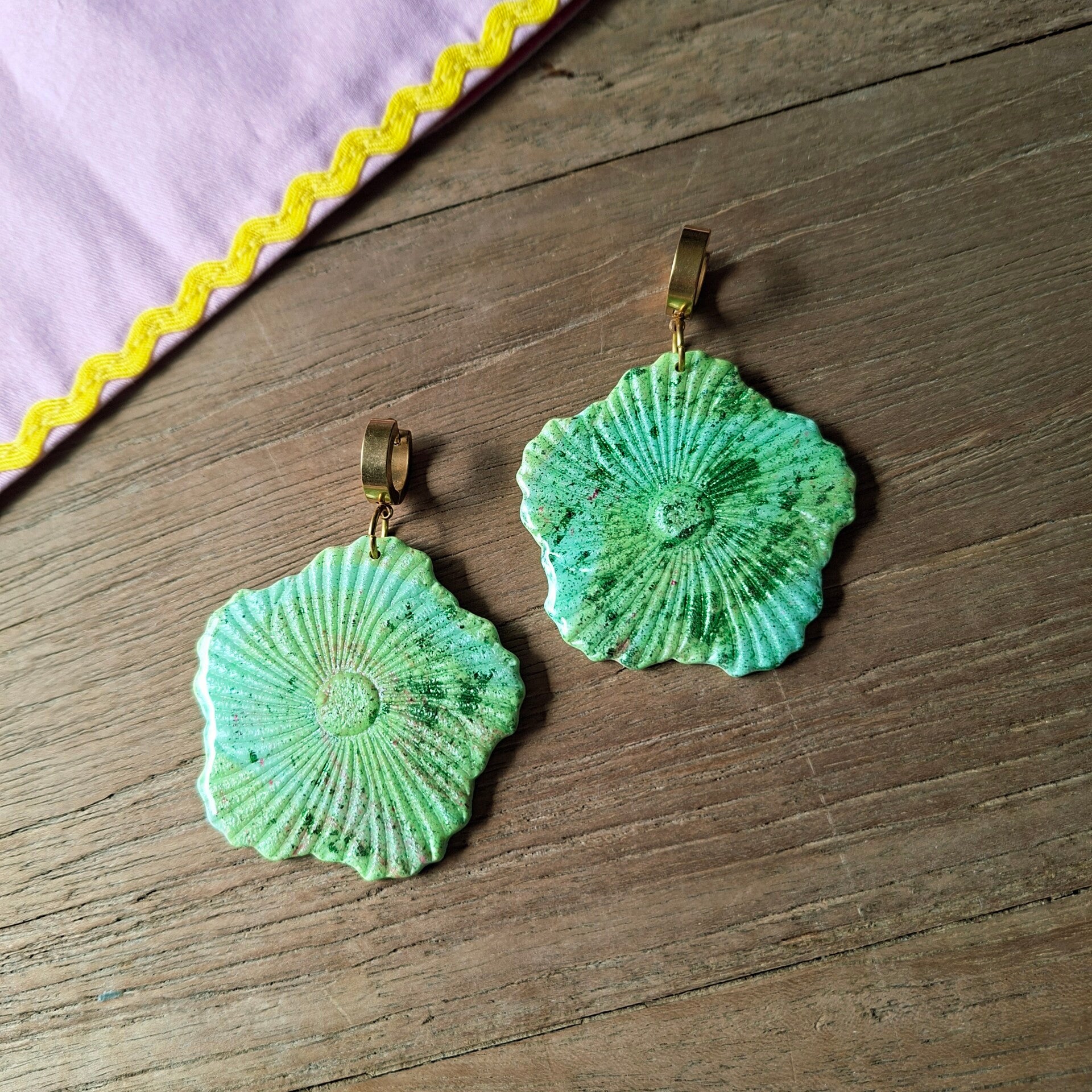 Dit is Flower Power op zijn best! Een oorbel die je een krachtige uitstraling geeft. Kijk die perfecte pistache/limoengroen ondergrond eens met een subtiele discodip aan kleuren en dat alles verzonken in een prachtige glans! Geef je outfit een boost met deze unieke Hibiscus van zo'n 5 cm groot. Een echte statement oorbel dus!