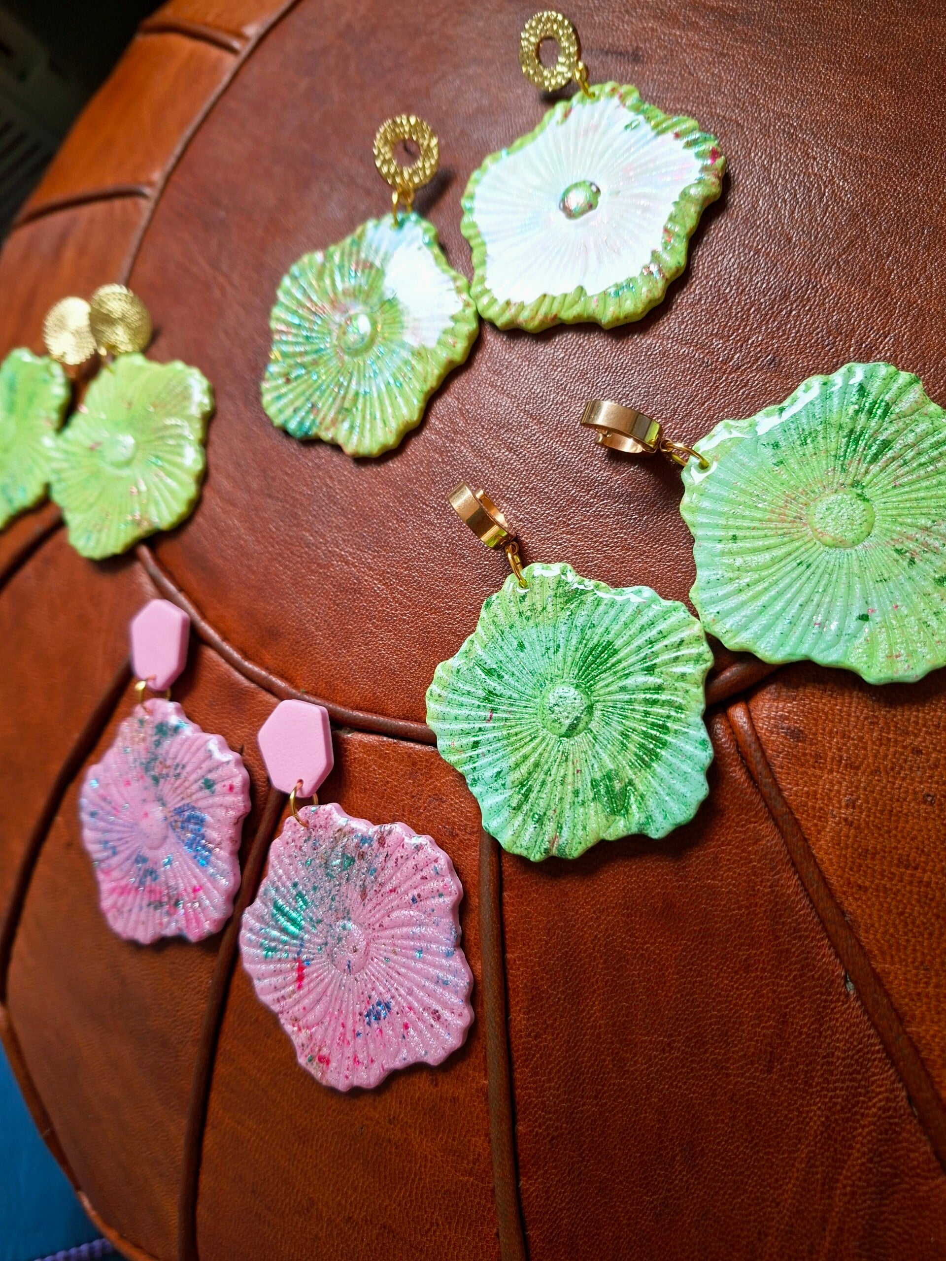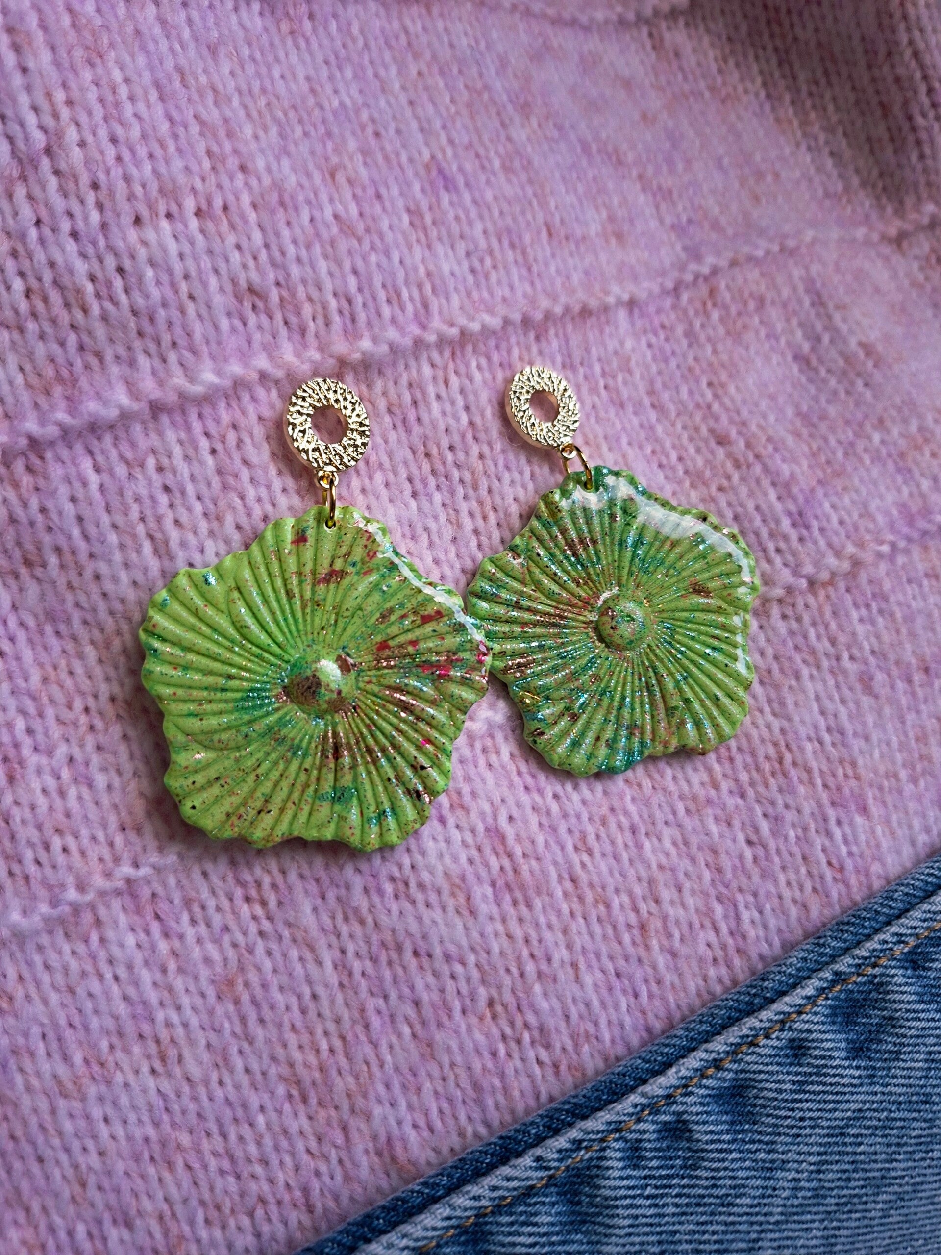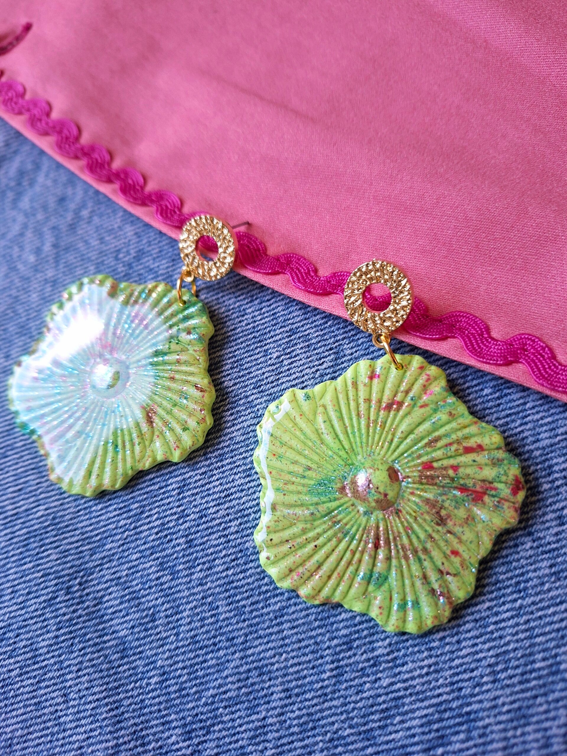 Dit is Flower Power op zijn best! Een oorbel die je een krachtige uitstraling geeft. Kijk die perfecte groene ondergrond met een subtiele discodip aan kleuren en dat alles verzonken in een prachtige glans! Geef je outfit een boost met deze unieke Hibiscus; de bloem zelf is zo'n 5 cm groot. Een echte eyecatcher dus!