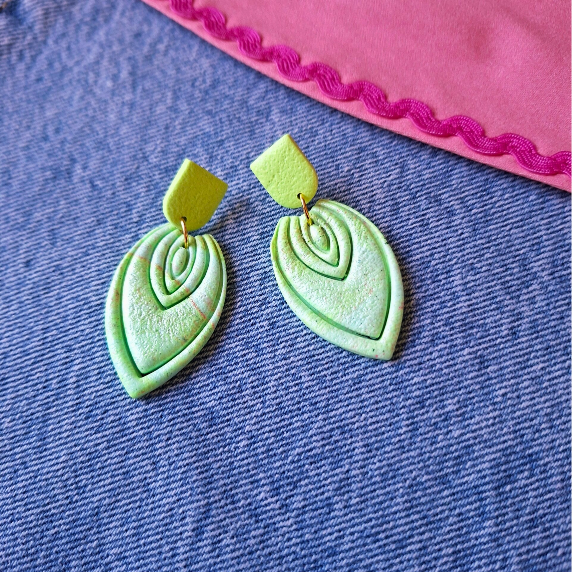 Unieke limegroene oorbel. Fijntjes en subtiel. Mooi bij modekleur bruin! Maar ook een fijne partner voor vrolijk gekleurde kleding!