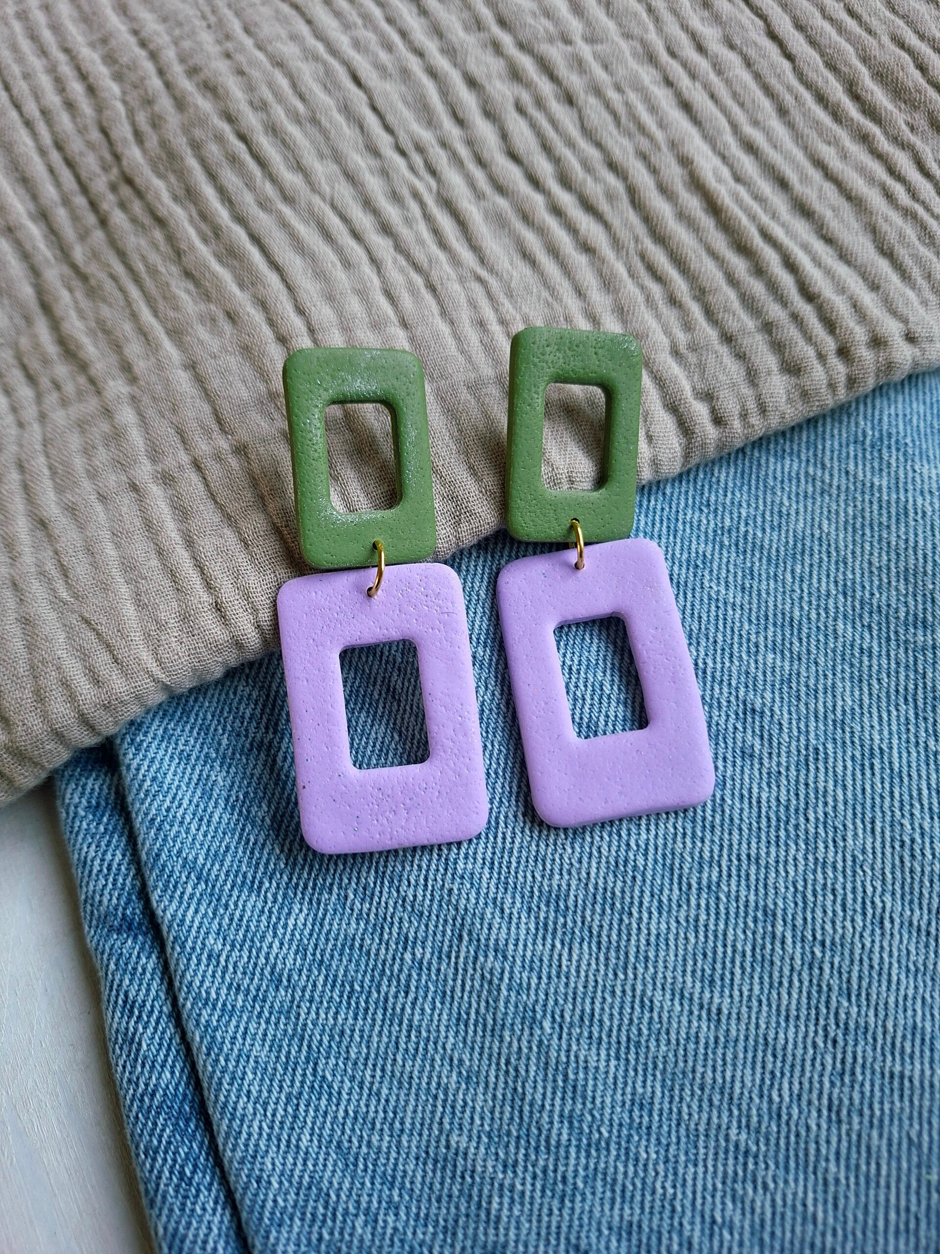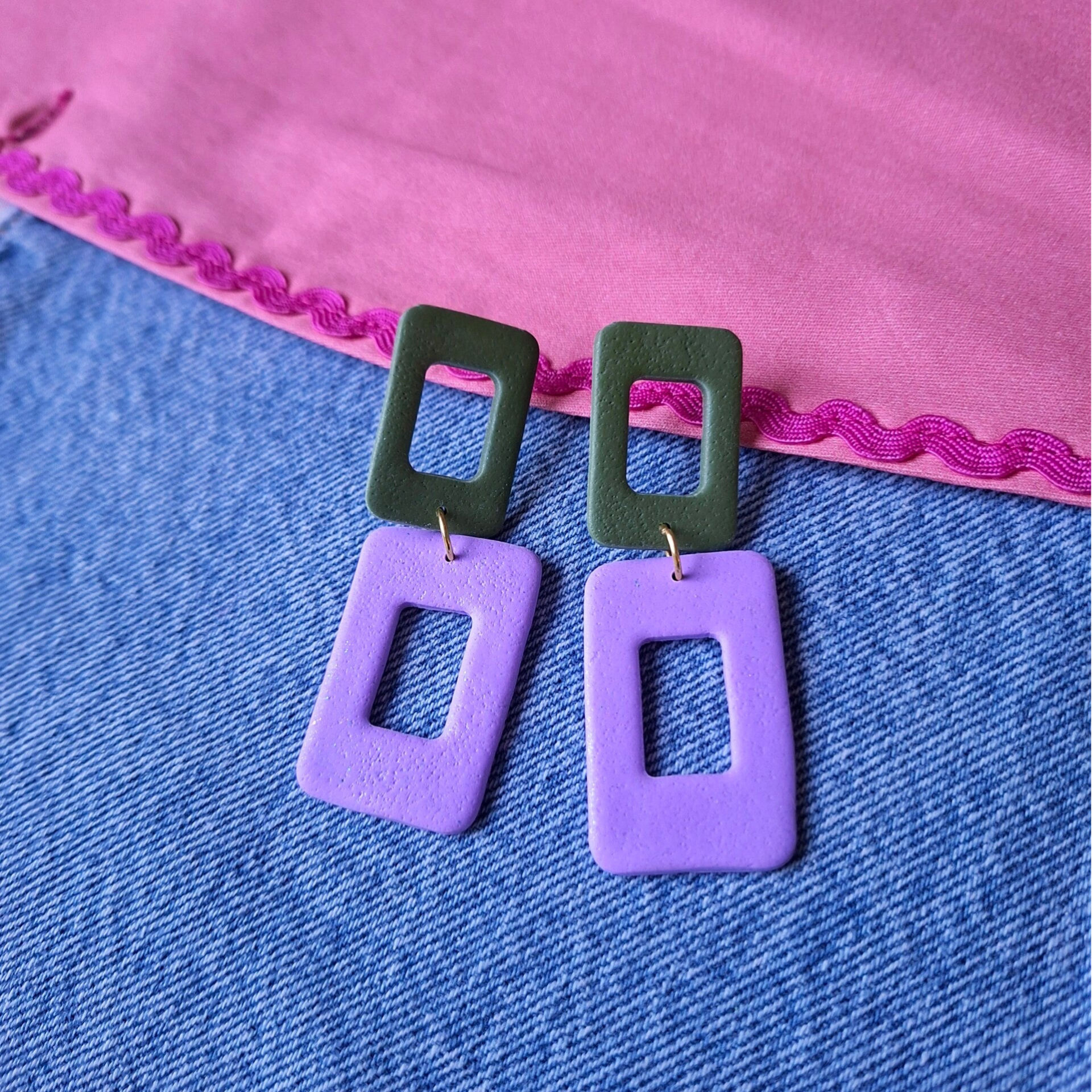 Grote statement oorbel in matte, ongepolijste structuur. Een perfect duo: lila & olijf. Durf jij het aan?!