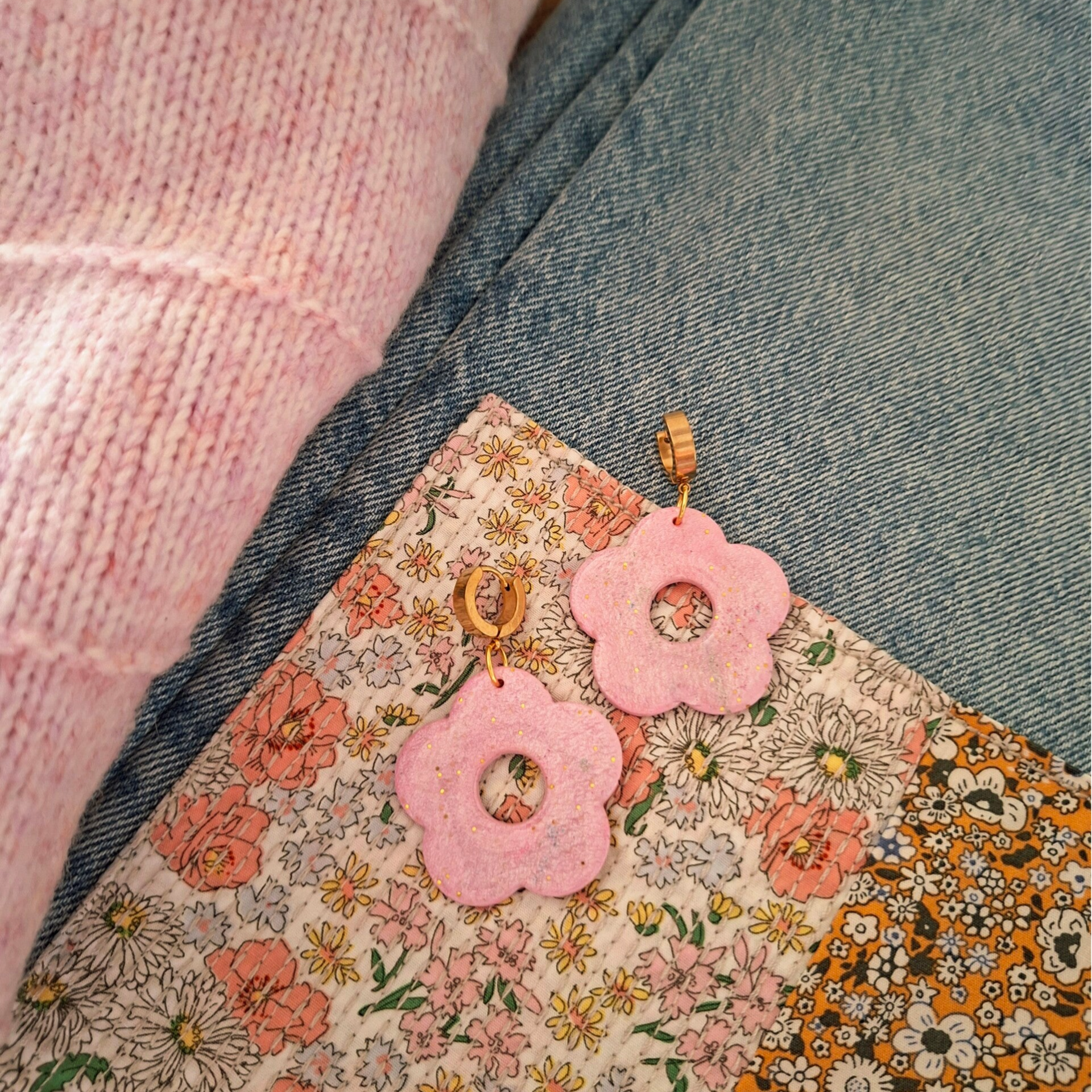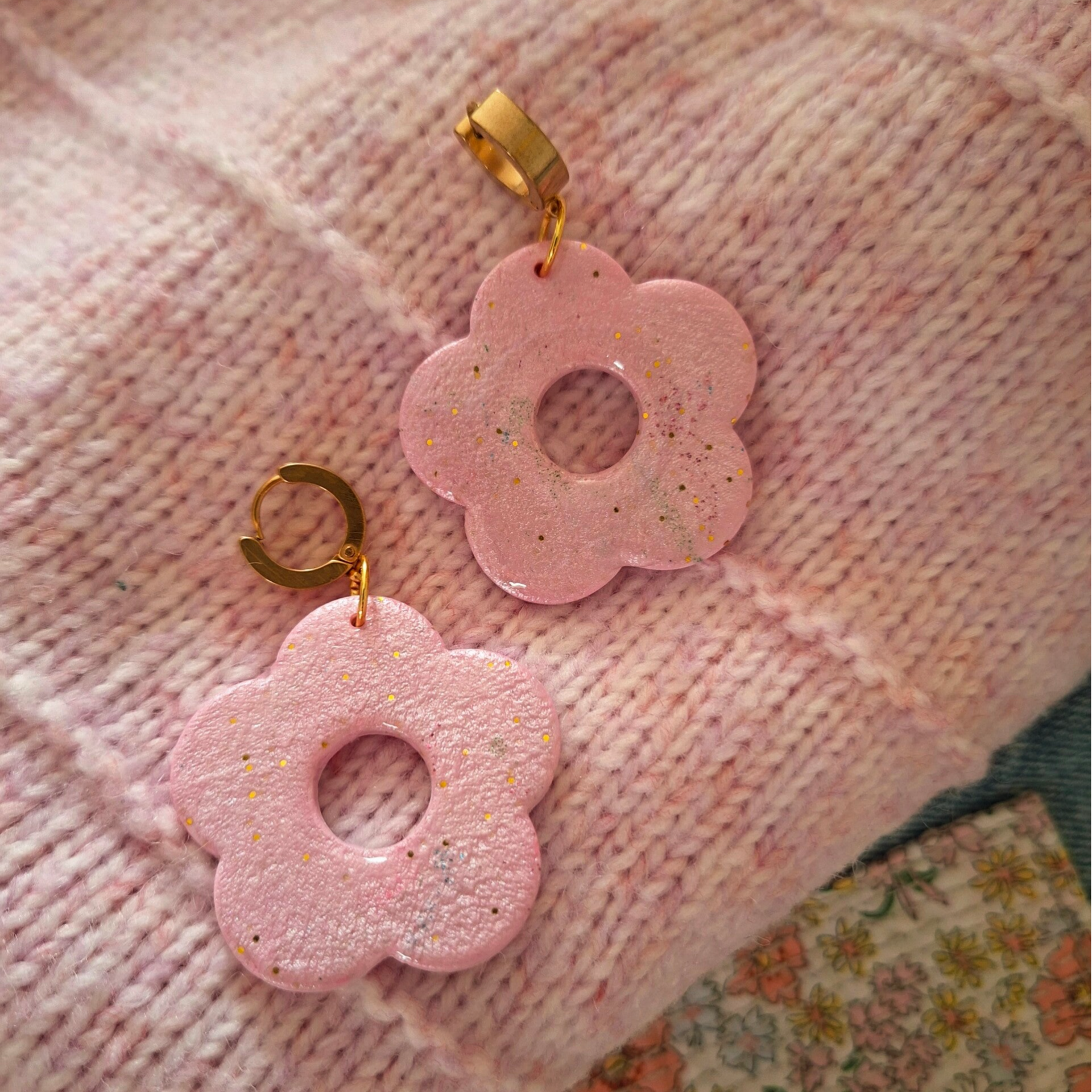 Vrolijke roze oorbel met sparkles en glans! Superleuk bij jeans en een mooie trui. Echt een alleskunner. Heerlijk formaat ook. Go with the flow!