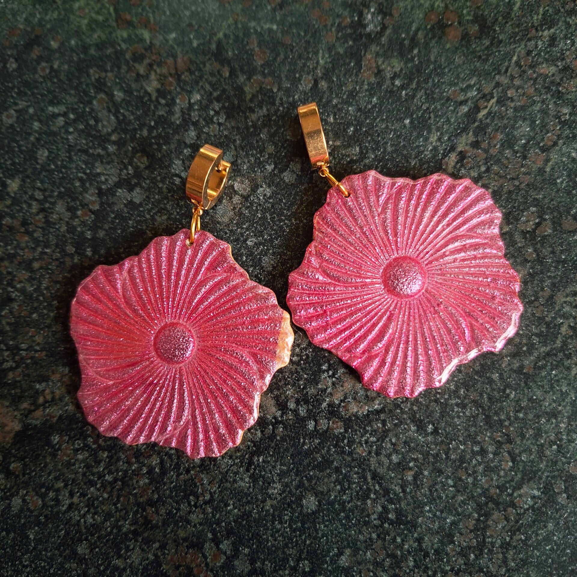 Op een ondergrond van paars en okergeel is een fuchsia/knalroze shimmer gelegd. Door de glanslaag is de kleur intenser. Een feestje om te dragen!