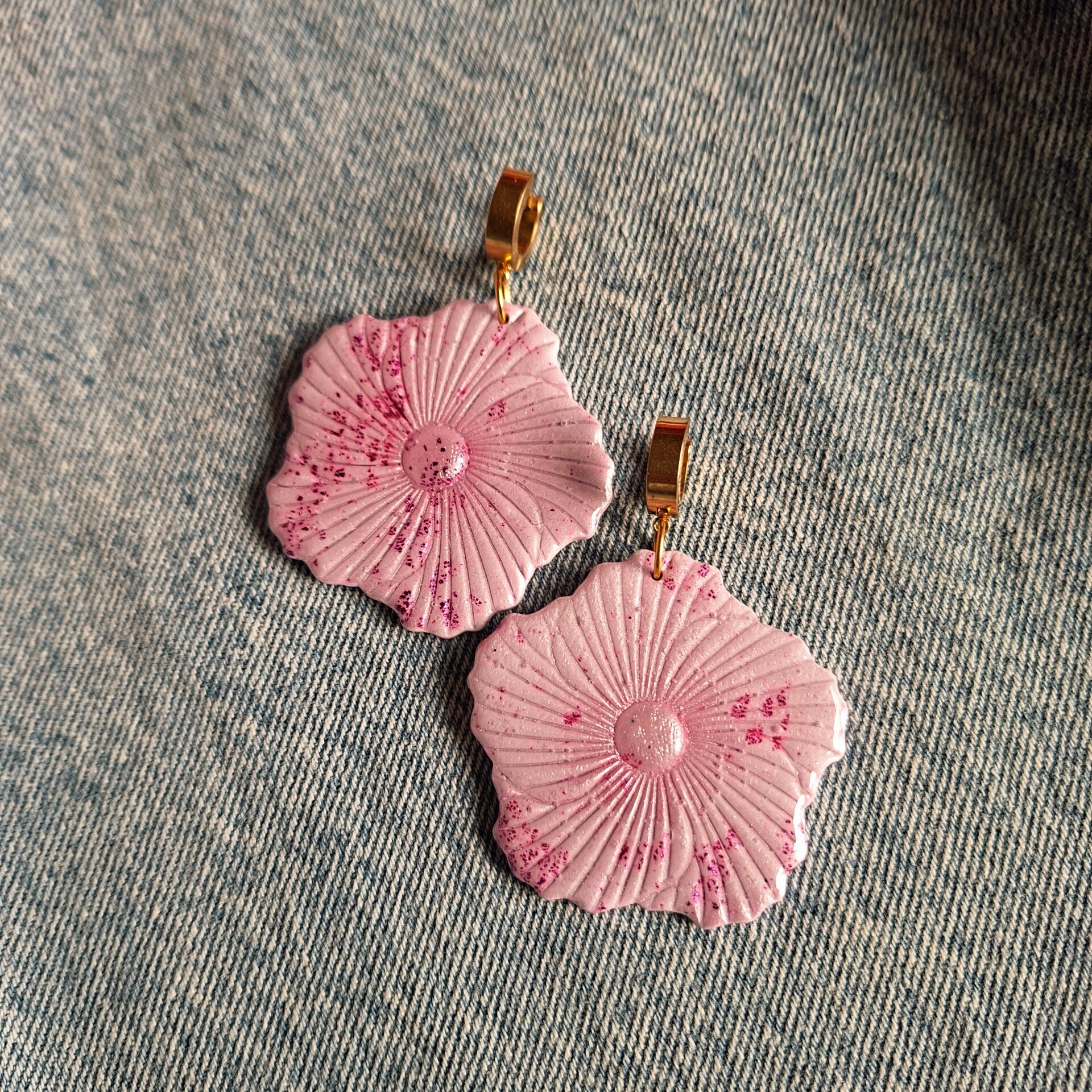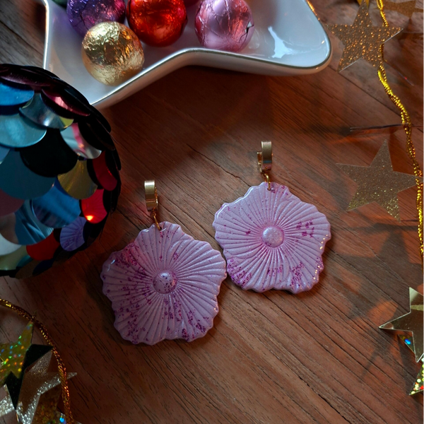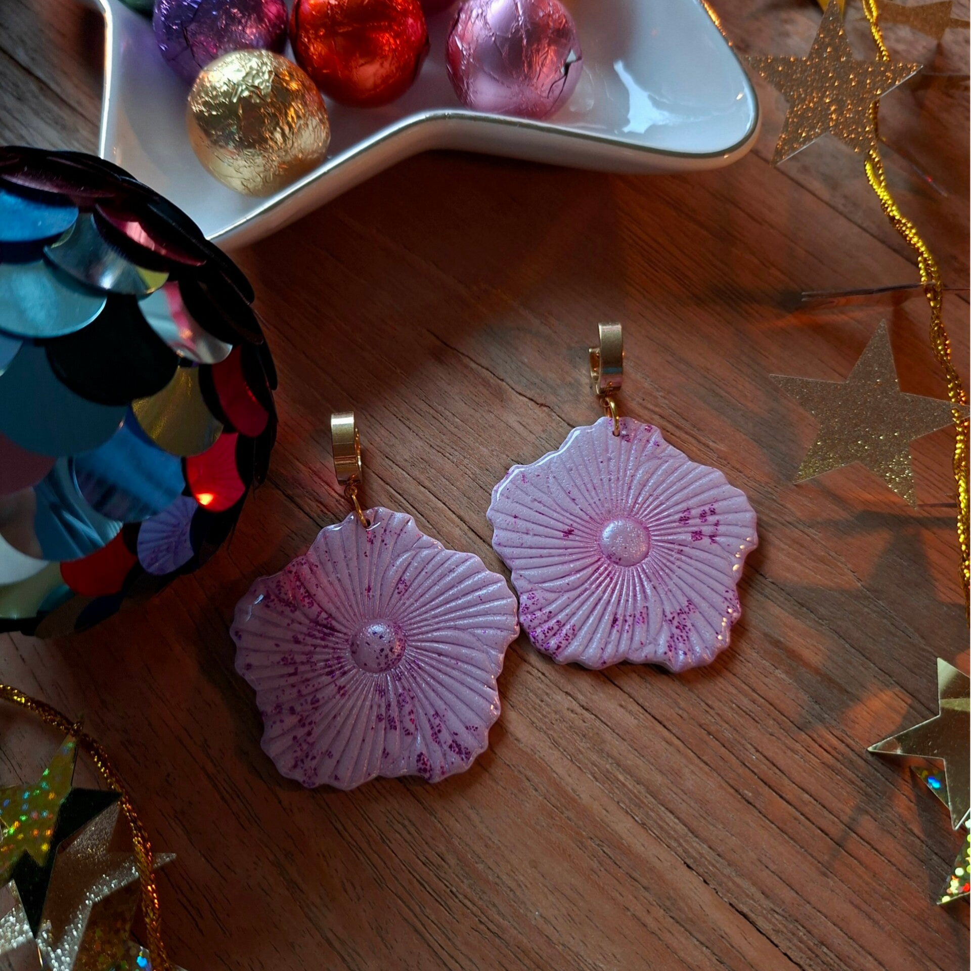 Grote glanzende Hibiscus oorbellen in Lila met paarse sparkles!