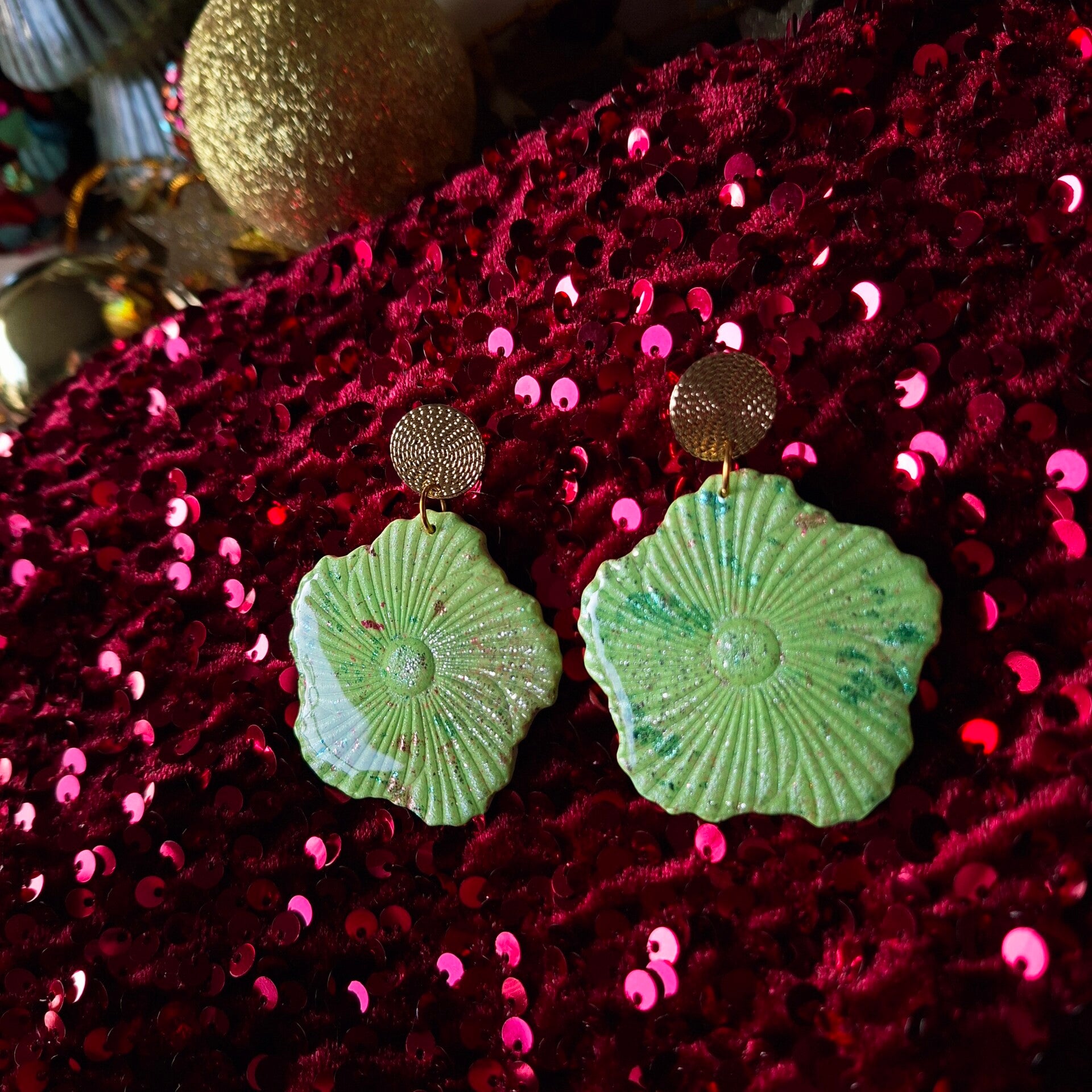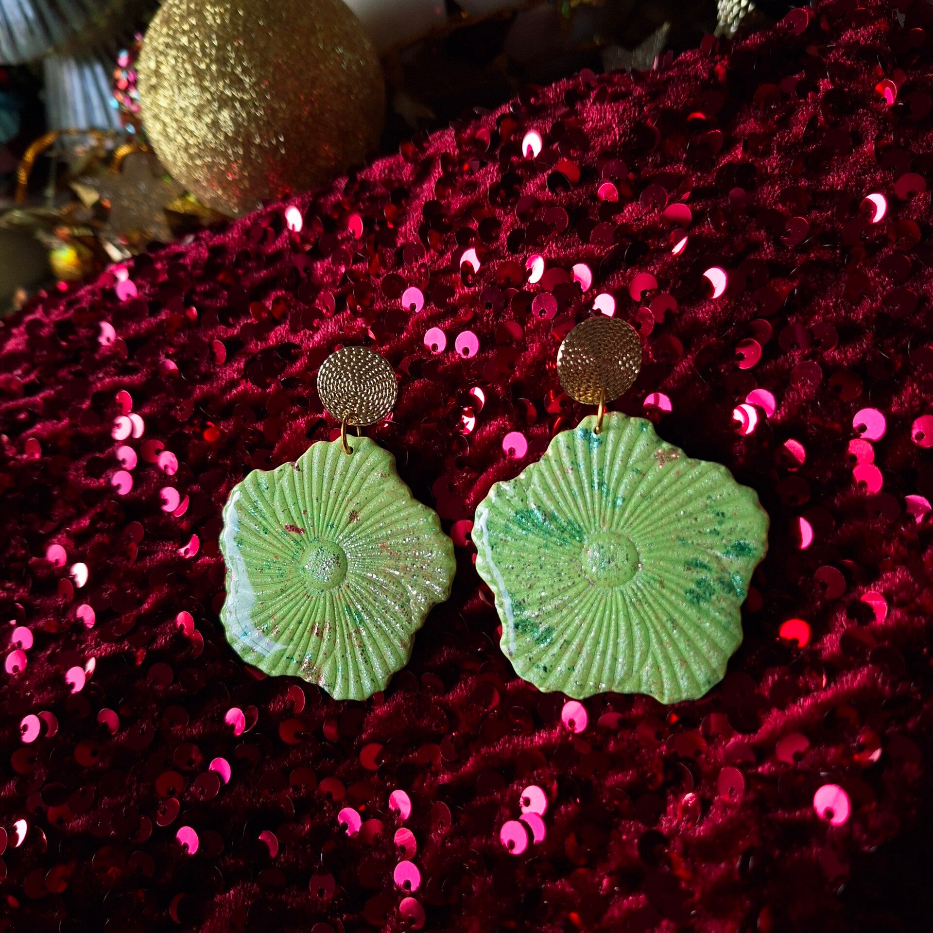 Frisse statement oorbel. Op een frisse limoengroene ondergrond zijn subtiele kleur sparkles aangebracht.