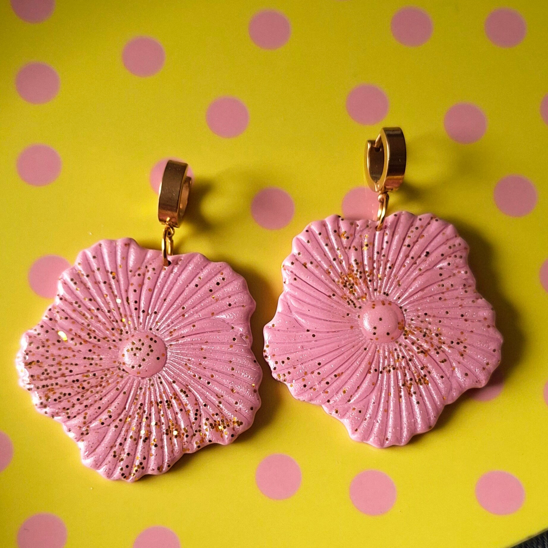 Zachtroze grote statement oorbel met goud sparkles. Liefde op het eerste gezicht!