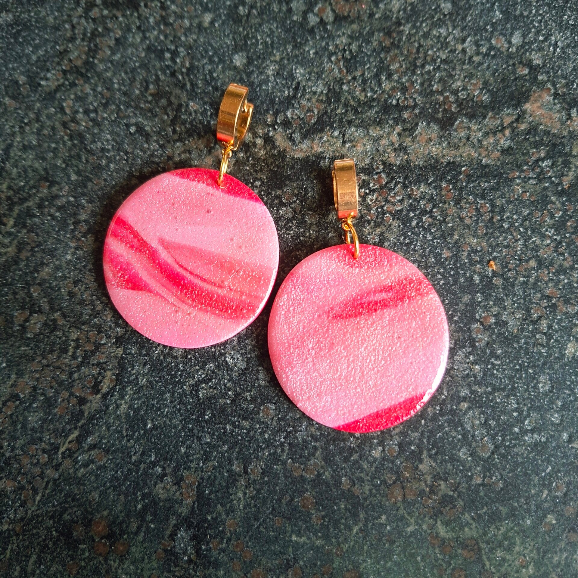 Indrukwekkende oorbel waarin de liefste kleuren samensmelten in een uniek kleurenpalet. Gemarmerd roze en fuchsia met een glans. Dat wordt genieten! Een plezier om naar te kijken.