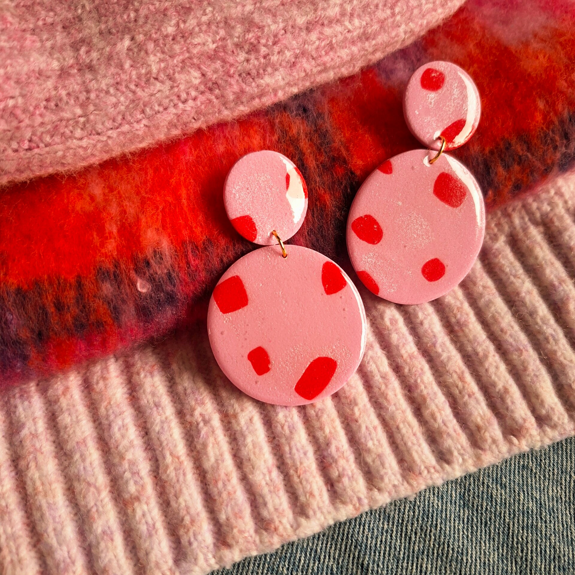 Grote statement oorbel met fantastische kleuren. Op een ondergrond van de perfecte zachtroze zijn rood/roze spikkels aangebracht. Een soort polkadot effect. Met mooie glans!