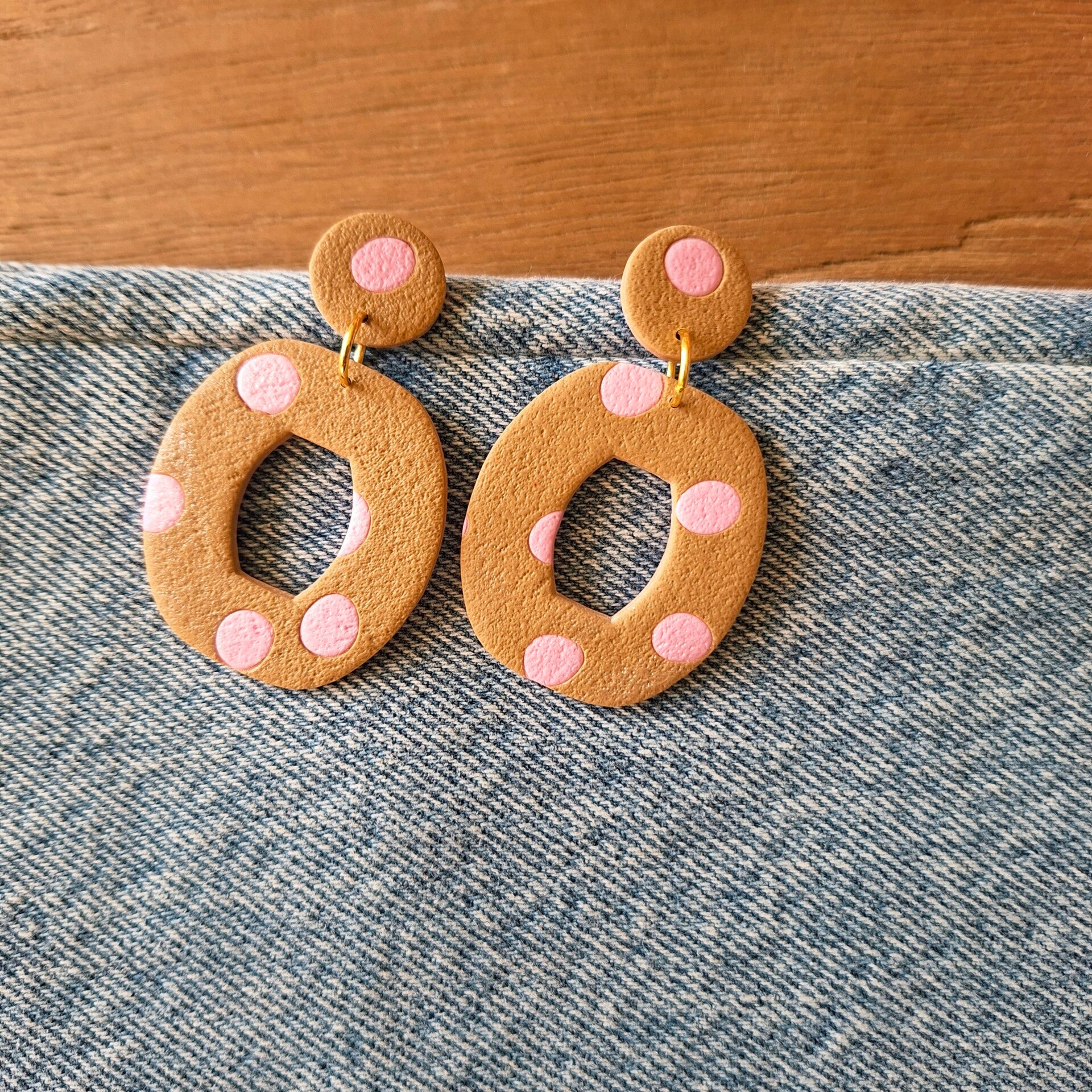 Matte polka dot oorbellen met een uniek kleurenpalet. Op een ondergrond van latte/taupe zijn zoete roze speelse dots aangebracht. Gewoon een origineel belletje waar je absoluut geen spijt van krijgt!