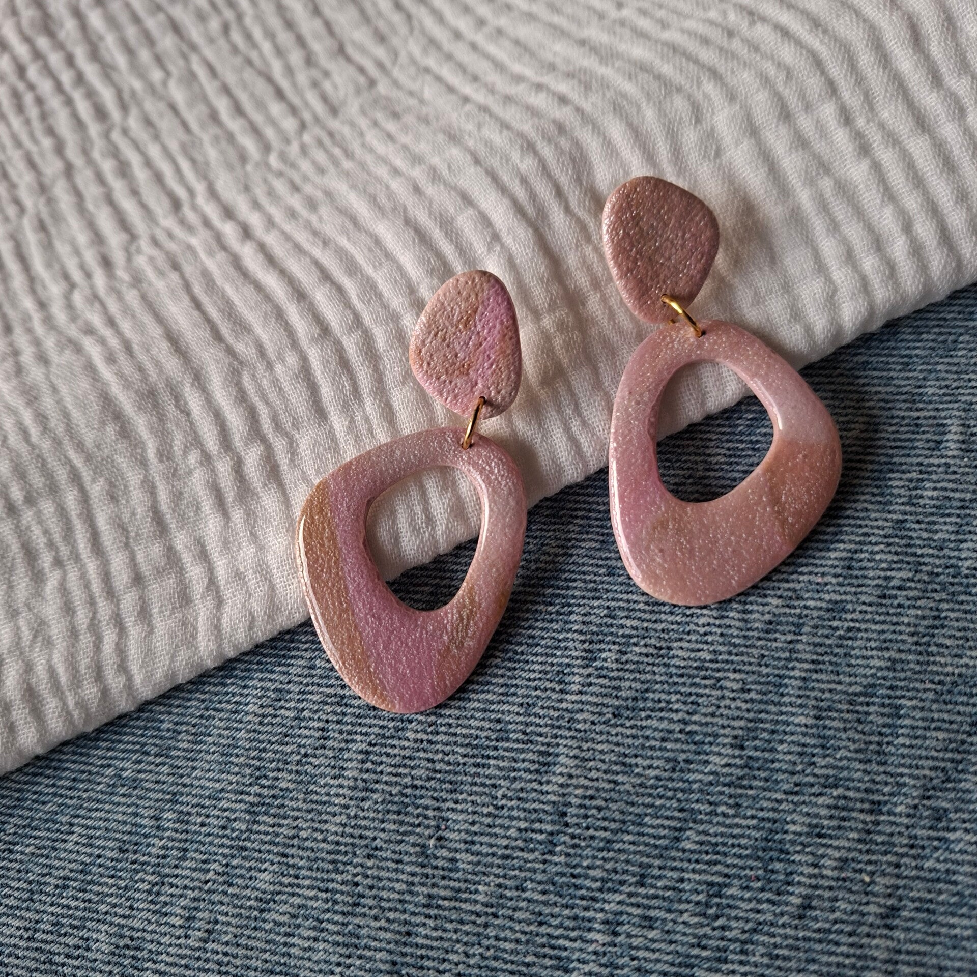 Een organische vorm in prachtige pastelkleuren. Lila, roze, taupe/olijf vormen samen een rustig geheel. Mat knopje, glanzende oorbel.