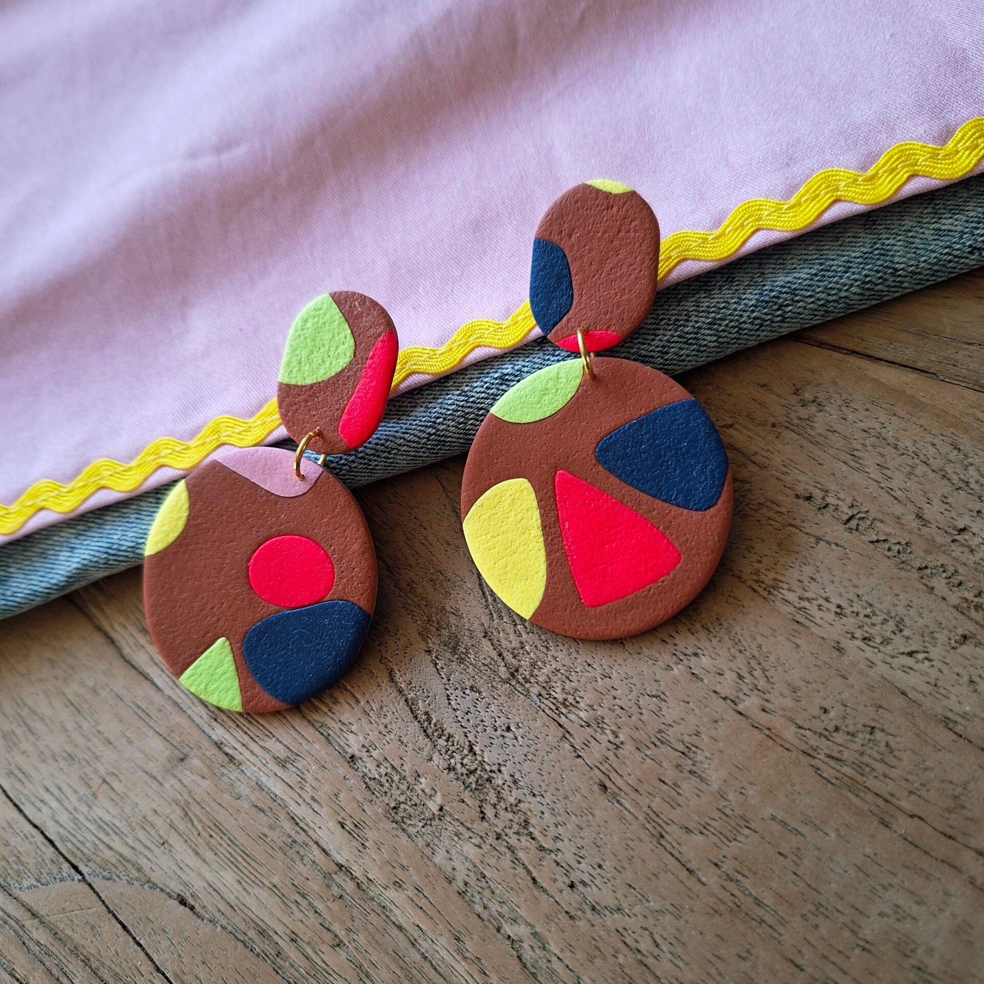 Grote, matte statement oorbel in terrazzo look. Op een ondergrond van bruin zijn de vrolijk gekleurde spikkels aangebracht. Gegarandeerd happyness!
