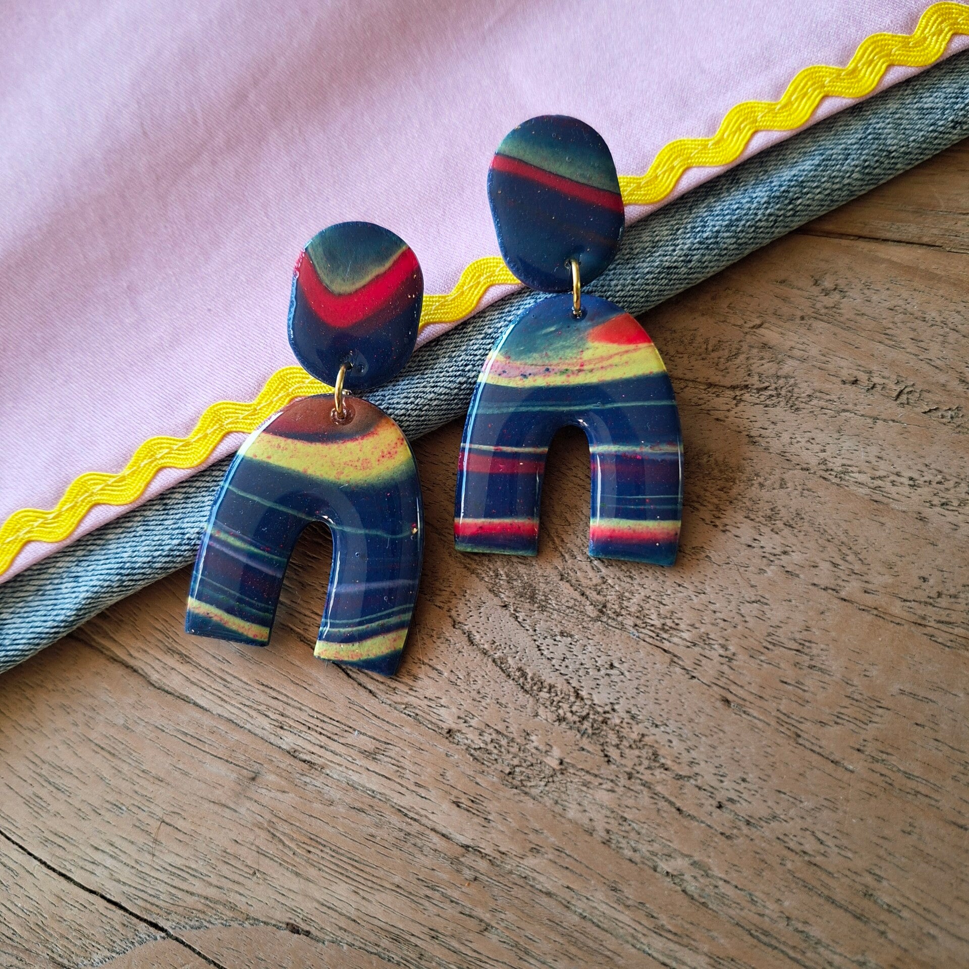 Op een donkerblauwe ondergrond zijn vrolijke gekleurde swirles aangebracht. De glans zorgt ervoor dat je altijd stralend voor de dag komt.